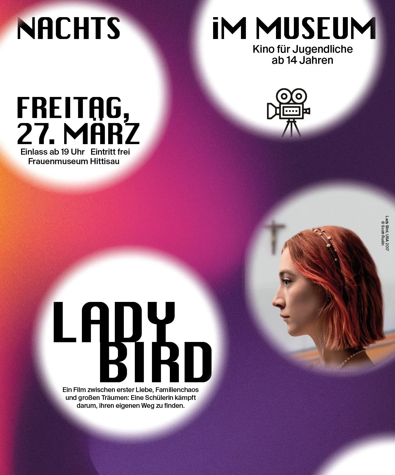 Wir zeigen Lady Bird (2017), ein einfühlsamer Coming-of-Age-Film von Greta Gerwig über das chaotische letzte High-School-Jahr der 17-jährigen Christine „Lady Bird“ McPherson, gespielt von Saoirse Ronan. In Sacramento träumt sie von einem Neuanfang an der Ostküste – und kämpft sich mit Humor, Herz und einer Portion Trotz durch Streit mit ihrer Mutter, erste Liebe und die große Frage: Wer will ich eigentlich sein?