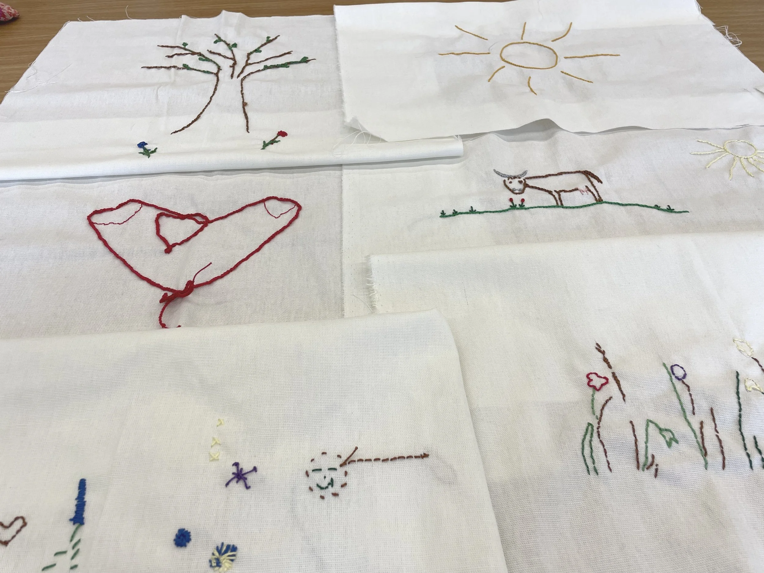 Ab dem Frühjahr 2020 kamen drei Gruppen von Menschen in Bizau, Dornbirn und Hohenems zusammen. Bei diesen Treffen erzählten sie über die vielseitigen Aspekte der Nachbarschaft früher und heute. Männer und Frauen, jung und alt, mit oder ohne Demenz bestickten dabei die hier ausgestellten Tücher. Beim Handarbeiten kommt man leichter ins Reden. Das Können war nicht wichtig, vielmehr ging es um die Lust am gemeinsamen Tun, Nachdenken und Erzählen. Die Zitate stammen aus den Tonmitschnitten der Gespräche. Pandemiebedingt hat sich das Projekt über einen langen Zeitraum erstreckt.